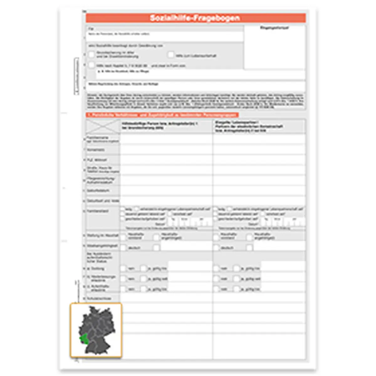 Sozialhilfeantrag (Muster für Rheinland – Pfalz), A4 6-seitig, 25 Stück