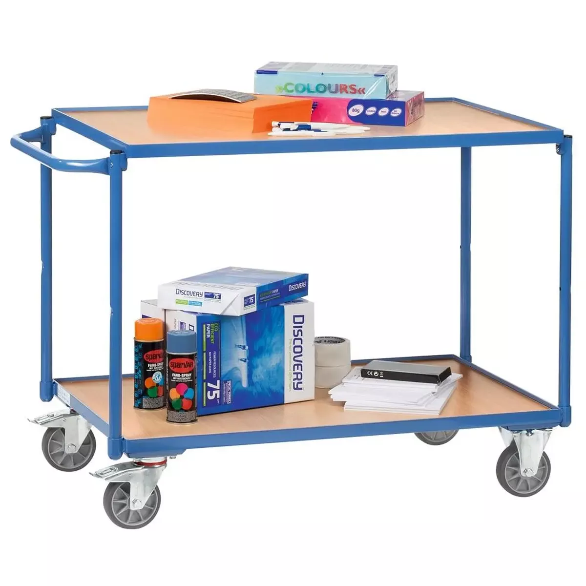 Tischwagen, 2 Ladeflächen LxB850x500 mm, Außenmaße LxBxH 1020x500x830 mm, waagerechter Schiebegriff, Traglast 300 kg, R