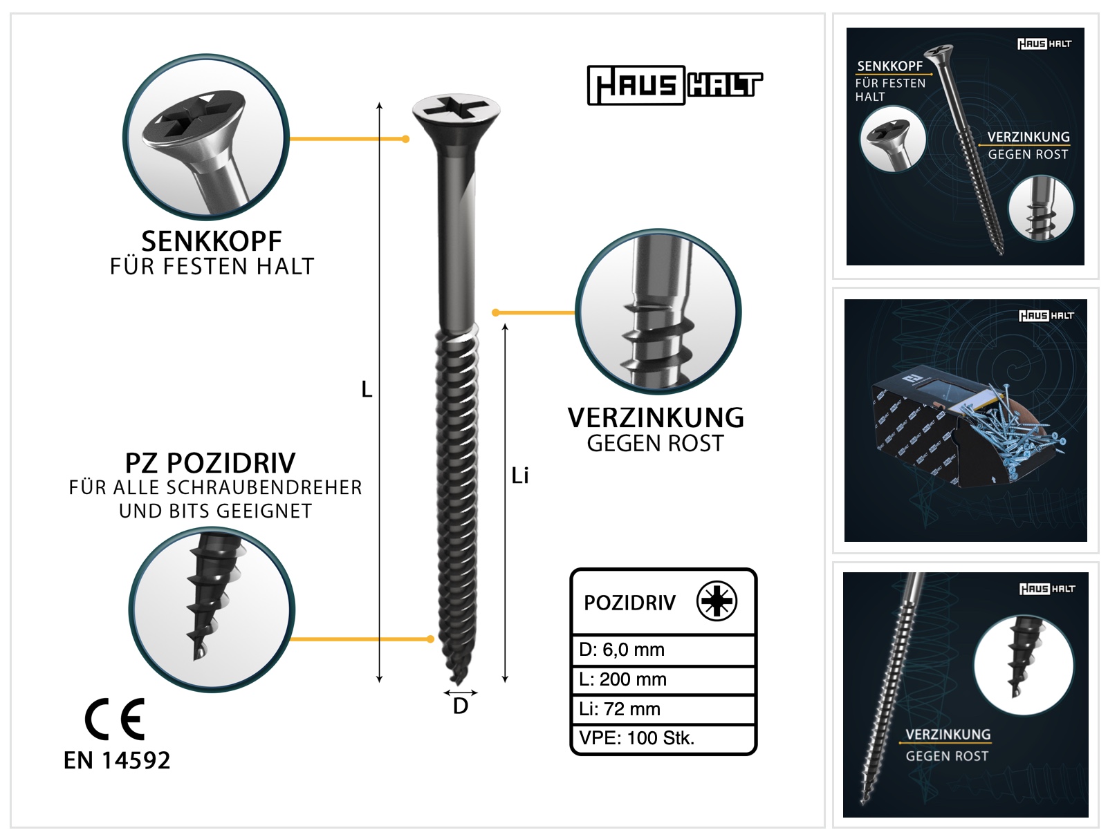HausHalt Universal Holzbauschraube Holzschraube 6,0 x 200 mm PZ3 100 Stk. ( 000051371223 ) silber verzinkt Kreuzschlitz Pozidriv Senkkopf Teilgewinde