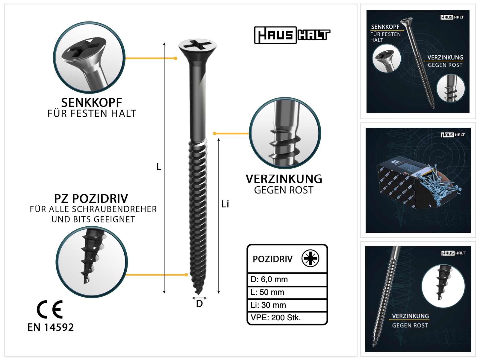 HausHalt Universal Holzbauschraube Holzschraube 6,0 x 50 mm PZ3 200 Stk. ( 000051371227 ) silber verzinkt Kreuzschlitz Pozidriv Senkkopf Teilgewinde