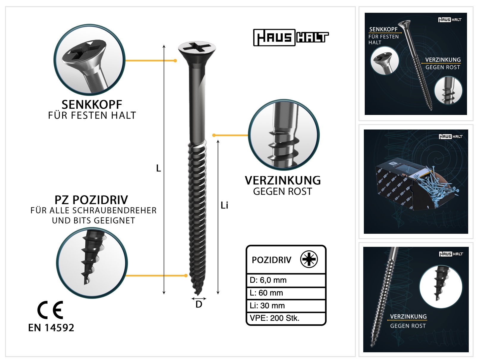 HausHalt Universal Holzbauschraube Holzschraube 6,0 x 60 mm PZ3 200 Stk. ( 000051371229 ) silber verzinkt Kreuzschlitz Pozidriv Senkkopf Teilgewinde