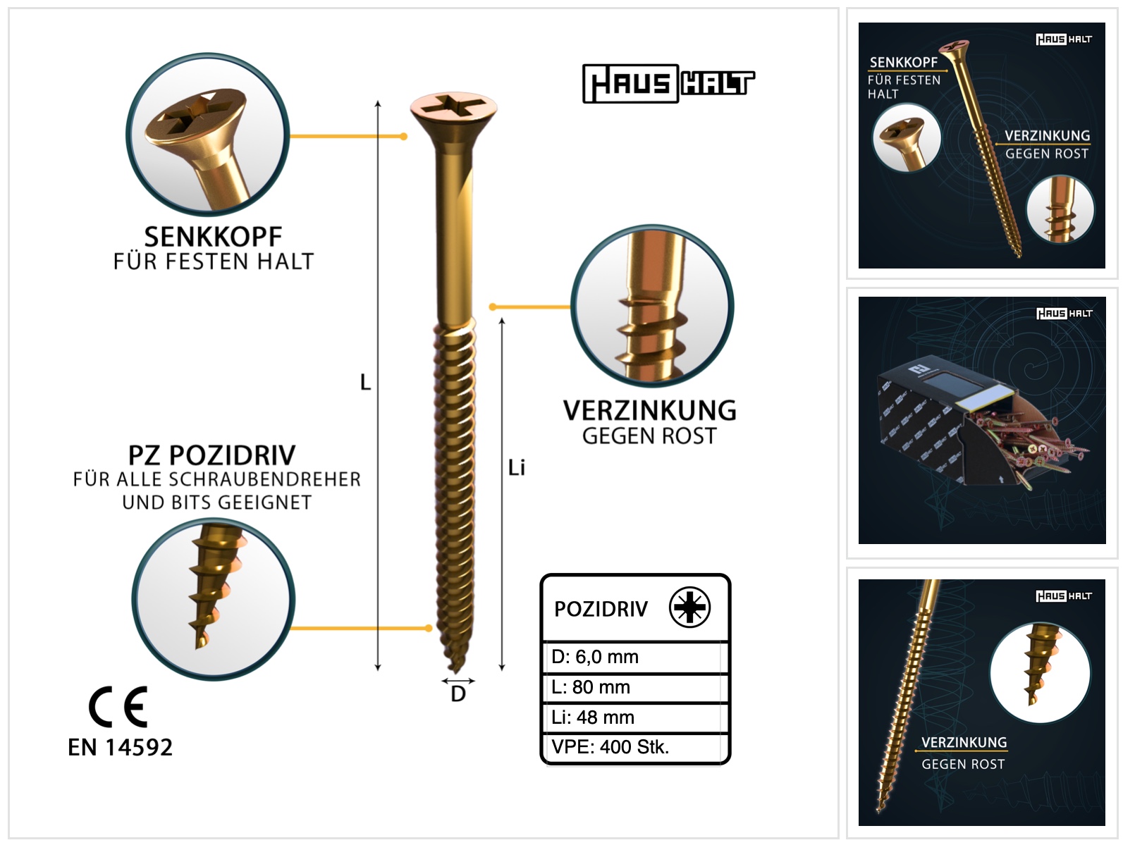 HausHalt Universal Holzbauschraube Holzschraube 6,0 x 80 mm PZ3 400 Stk. ( 2x 000051371233 ) gelb verzinkt Kreuzschlitz Pozidriv Senkkopf Teilgewinde