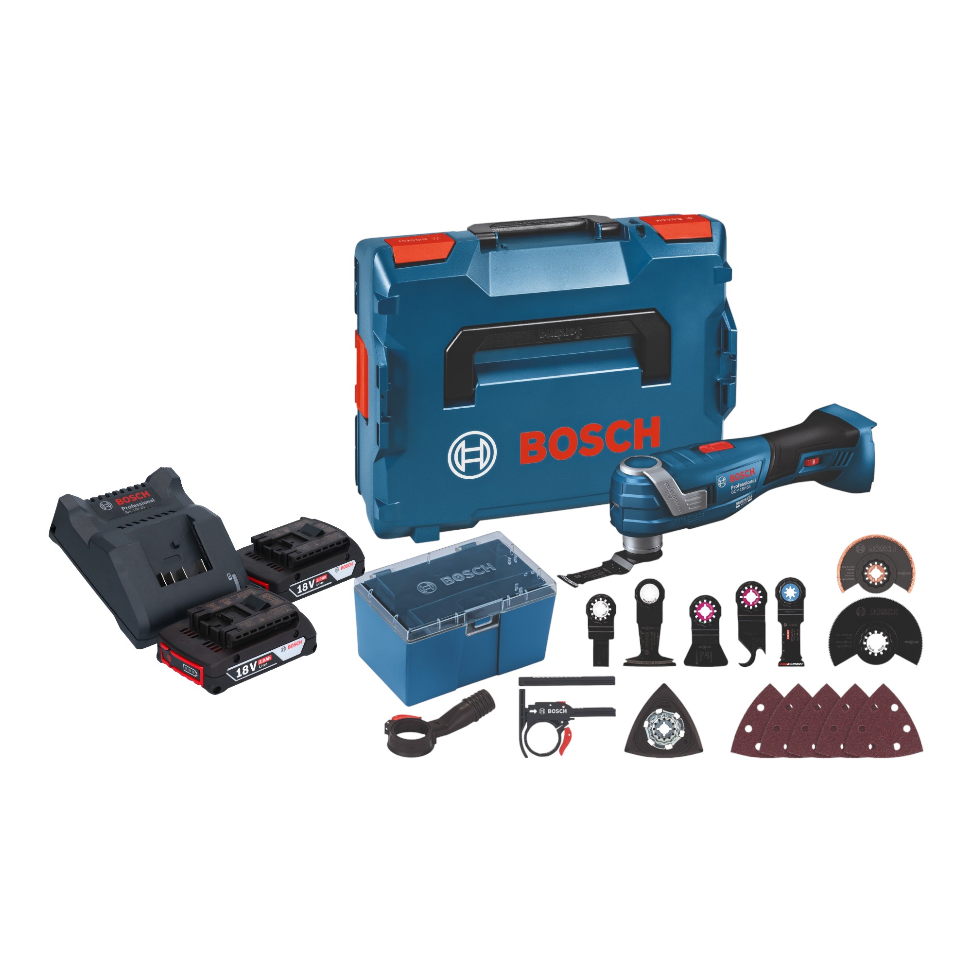 Bosch GOP 18V-34 Professional Akku Multi Cutter 18 V Starlock Plus + 2x Akku 2,0 Ah + Ladegerät + 17 tlg. Zubehör + L-Boxx