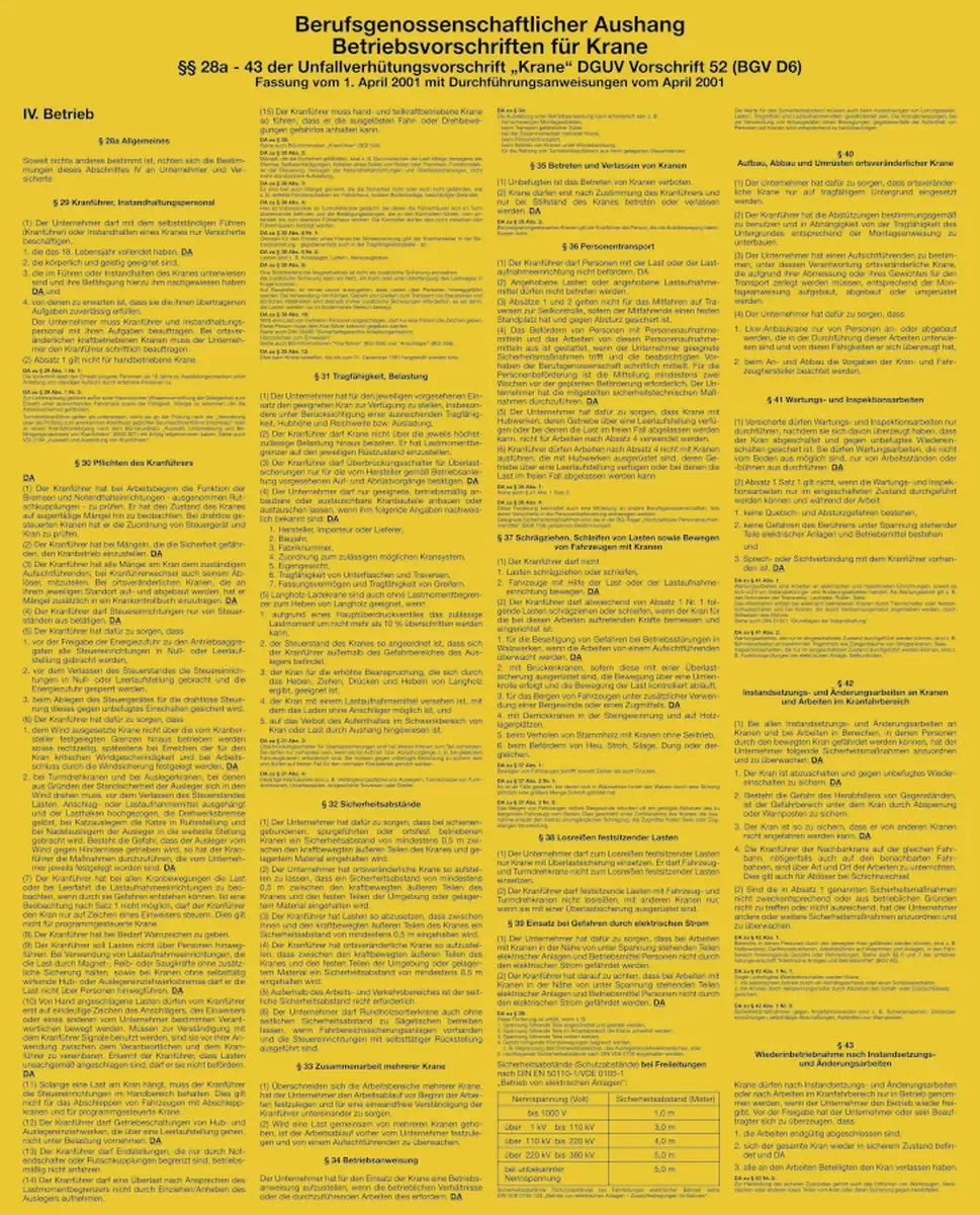 Betriebsvorschriften für Krane, Kunststoff, 420×520 mm
