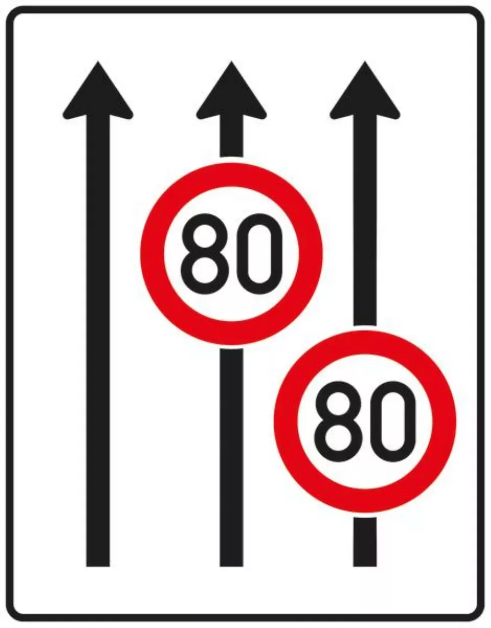 Verkehrszeichen 523-31 Fahrstreifentafel – ohne Gegenverkehr mit integriertem Zeichen 274 – dreistreifig in Fahrtrichtung; neues Zeichen – 1600×1250 3 mm RA1