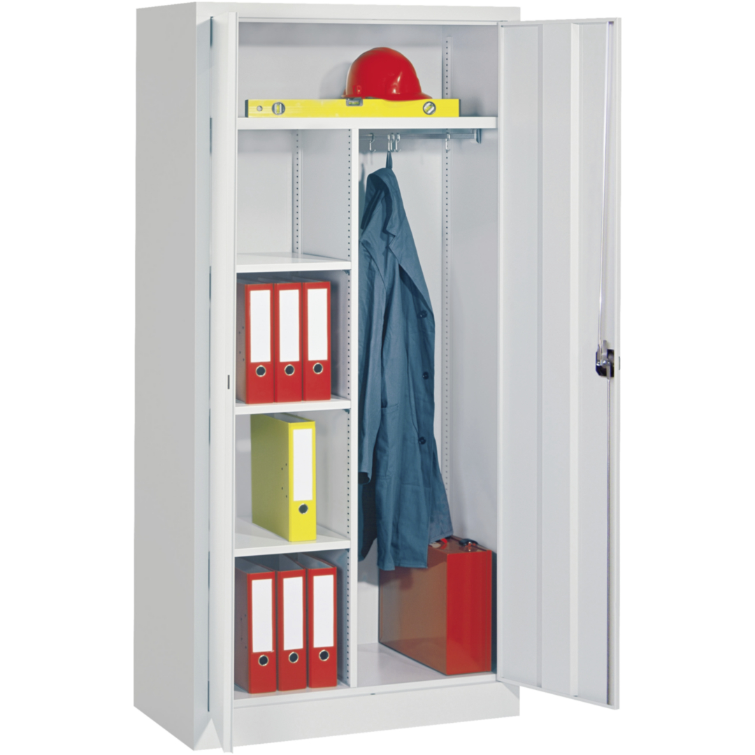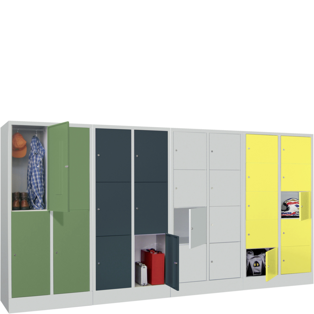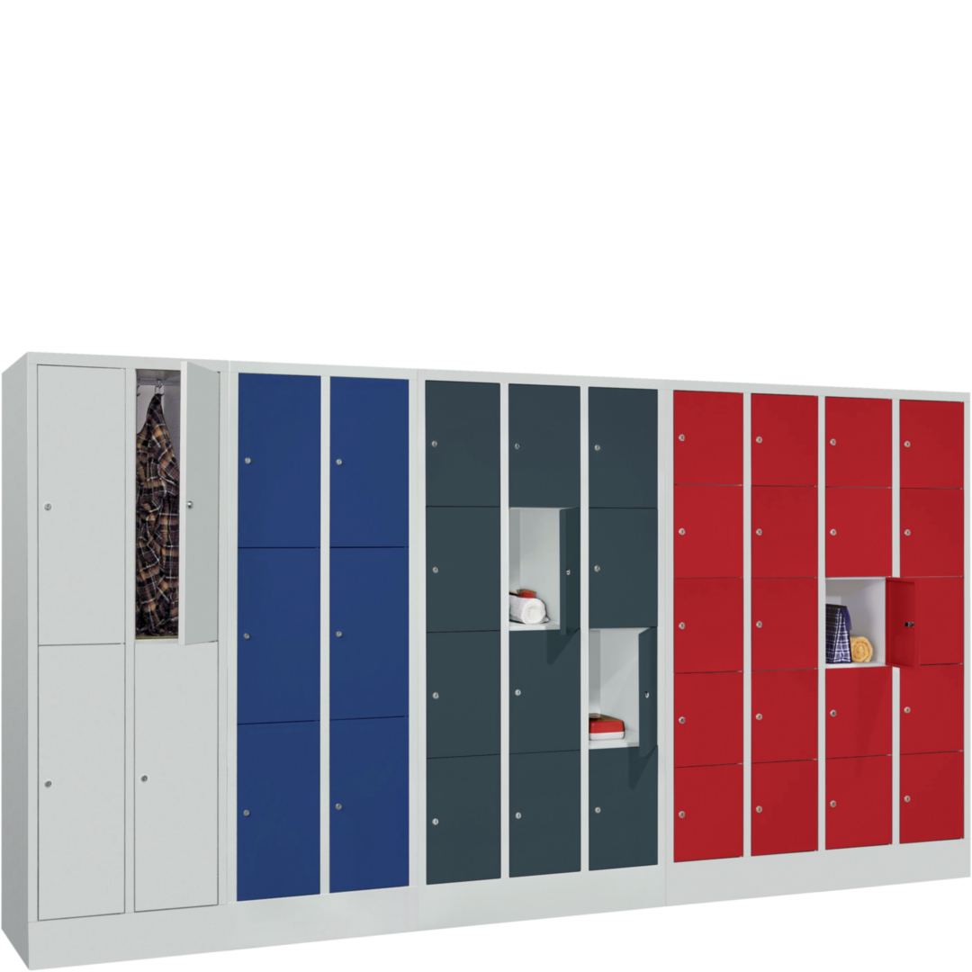 stabile Stahlblechkonstruktion, pulverbeschichtet (Strukturlack) · Tür abschließbar mit Zylinderschloss · Rückwand mit Vierkantlochung 10 x 10 mm, Lochabstand 38 mm