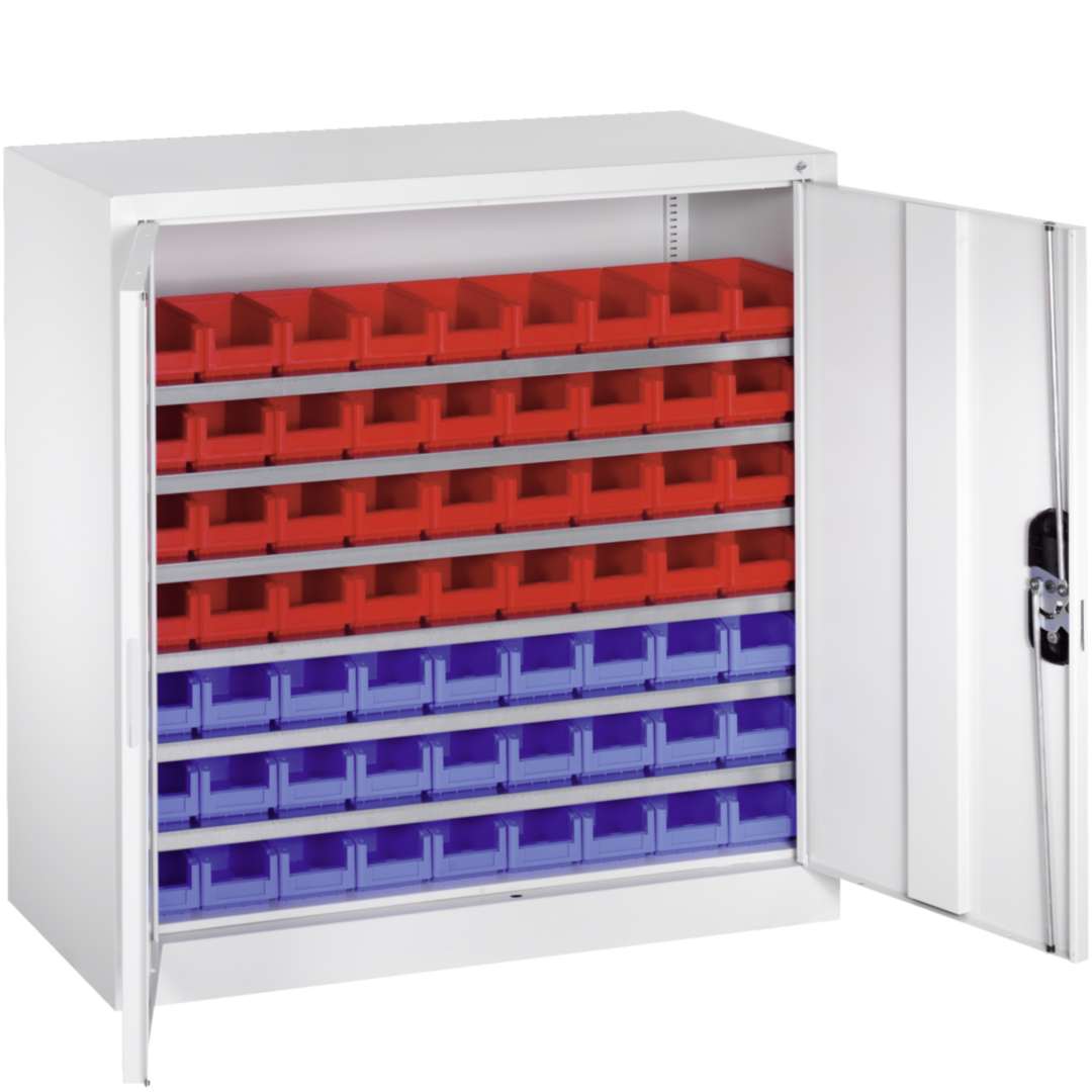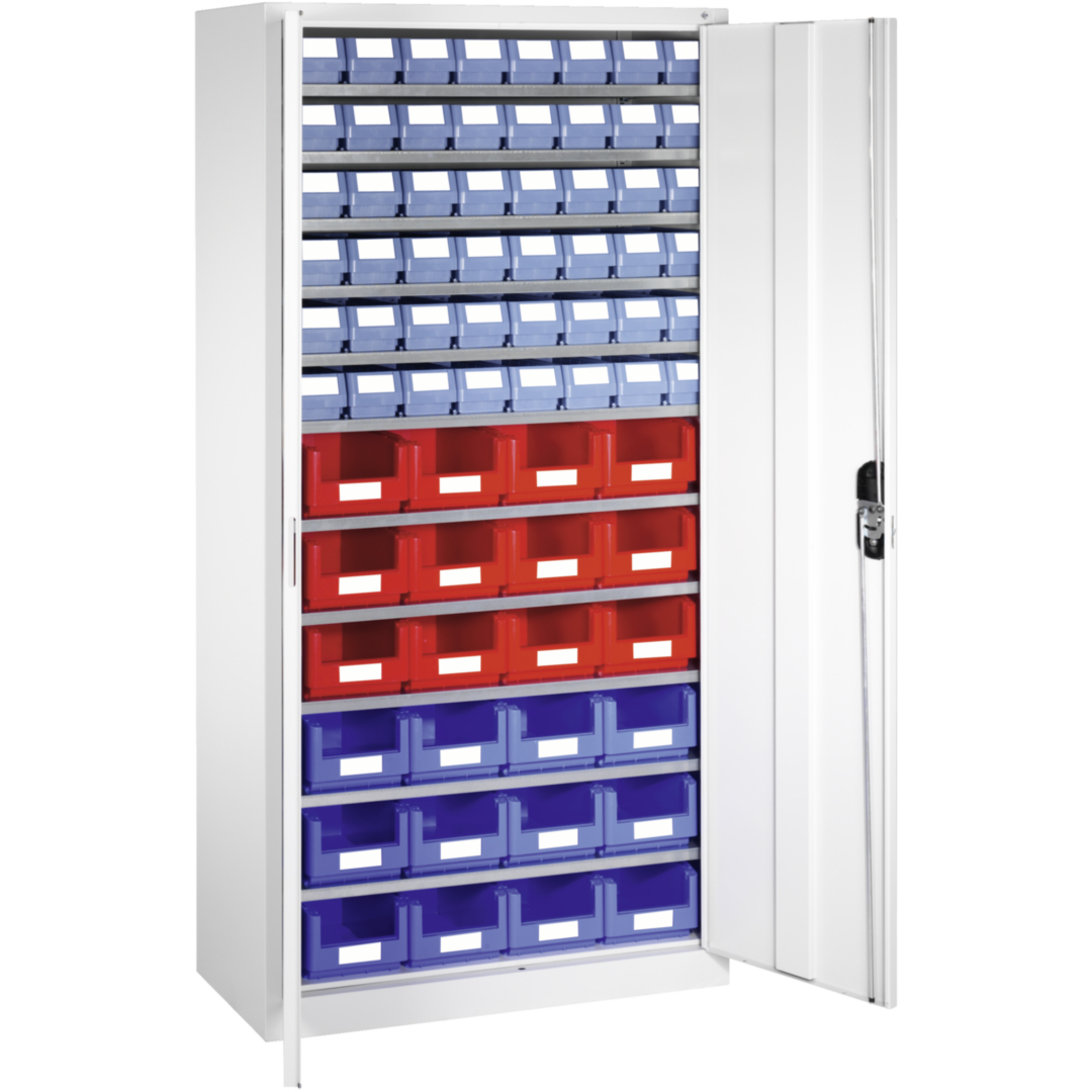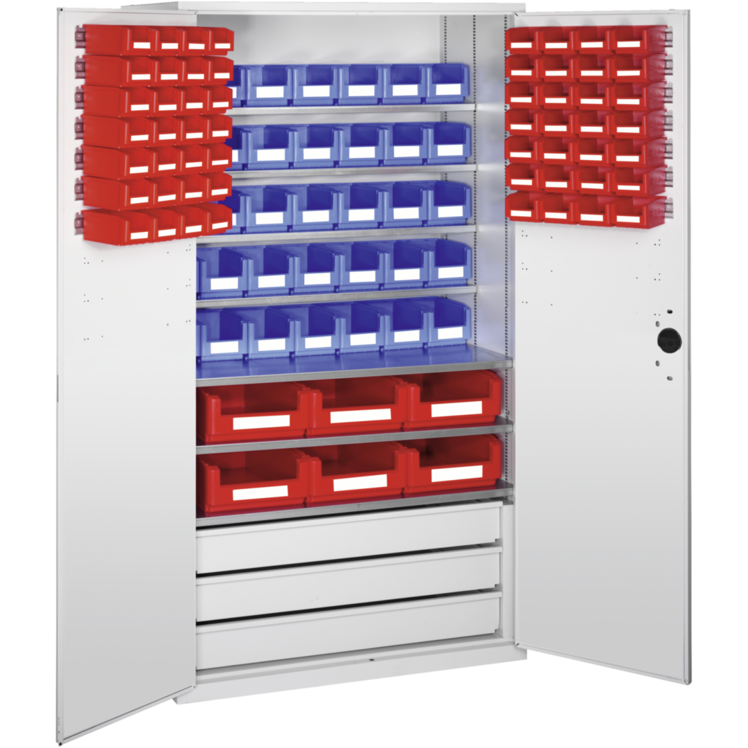 stabile Stahlblechkonstruktion, pulverbeschichtet (Strukturlack) · Tür abschließbar mit Zylinderschloss · Rückwand mit Vierkantlochung 10 x 10 mm, Lochabstand 38 mm